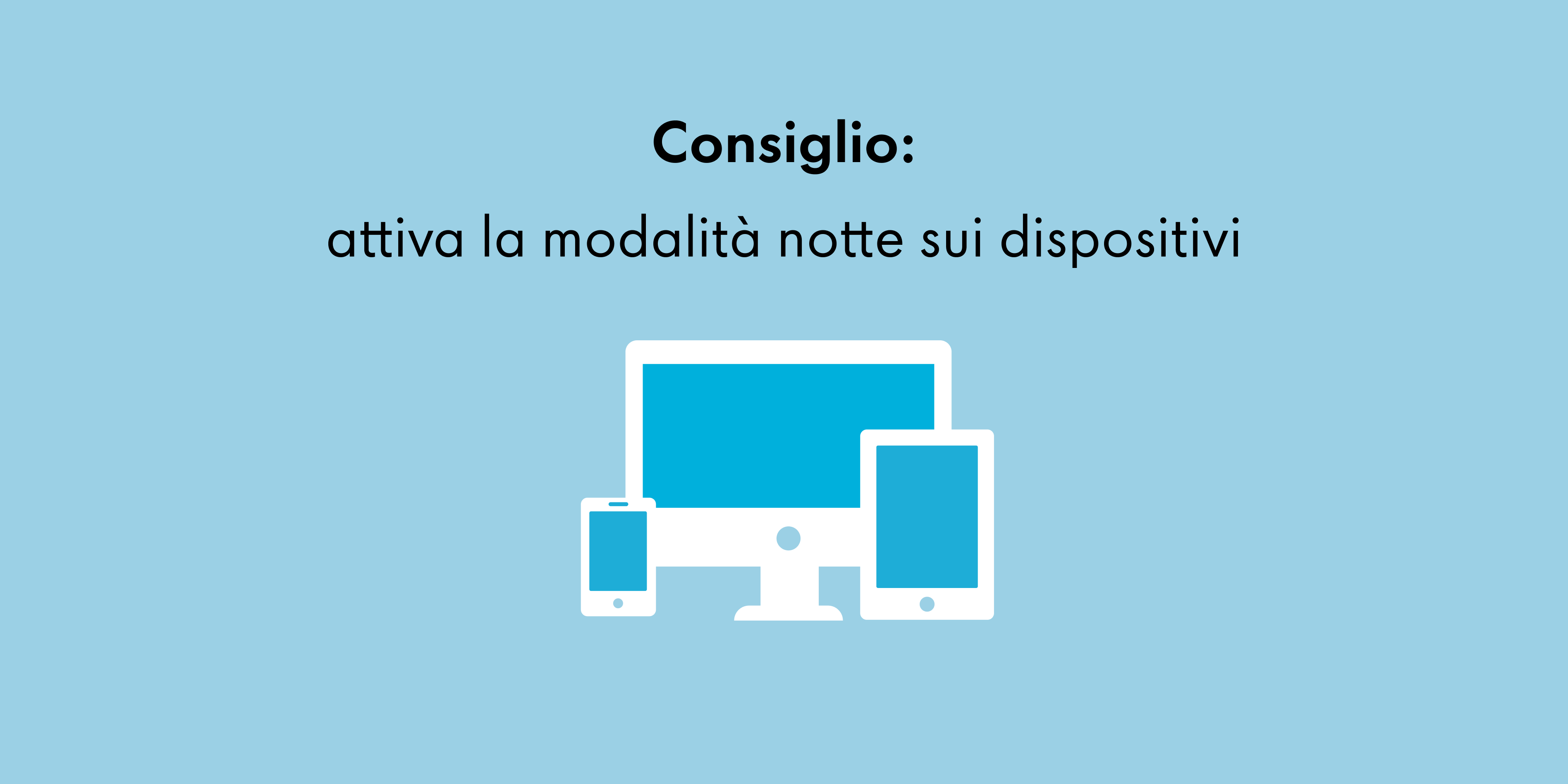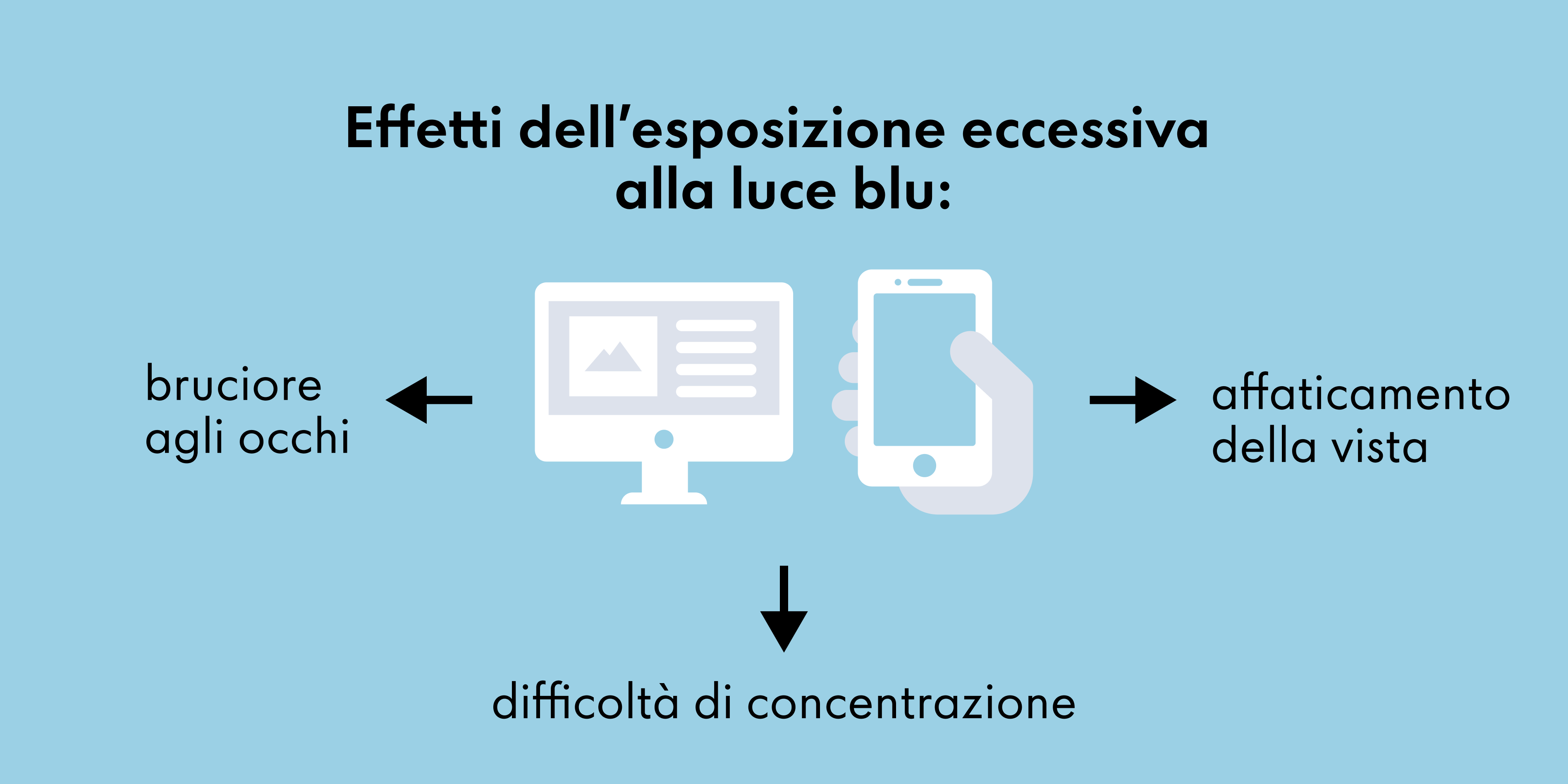 Un’esposizione molto prolungata alla luce blu può essere dannosa per gli occhi e dare al corpo segnali errati che influiscono in modo duraturo sul benessere e il ritmo sonno-veglia. Il problema è che non solo il sole emette luce blu, ma anche i dispositivi digitali come gli smartphone o il televisore e i nostri occhi non sono capaci di distinguere tra la luce del giorno e quella dello schermo. Anche le luci LED emettono parecchia luce blu. Quindi è consigliabile ridurre la luce blu a cui si è esposti ogni giorno, soprattutto per chi trascorre molto tempo davanti a uno schermo.