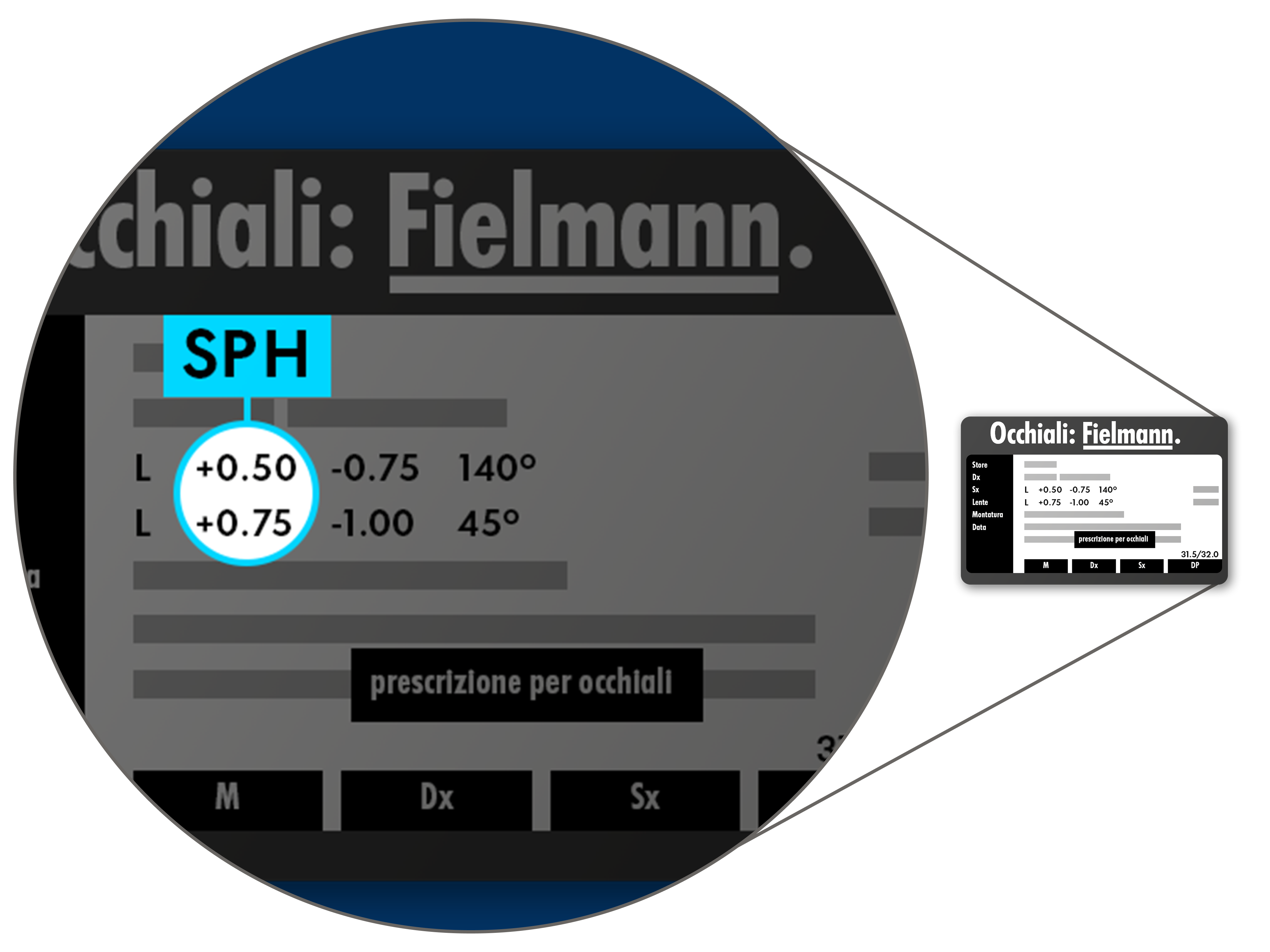 La sfera indica in intervalli di 0,25 la lunghezza focale e la curvatura che servono per correggere un difetto della vista. Maggiore è il numero, maggiore sarà l’entità del difetto della vista. Se il valore è positivo, ovvero è senza segno o presenta un più davanti, indica una ipermetropia. Se il numero è negativo, preceduto quindi da un meno, indica una miopia. Questo valore, dunque, indica se alla persona servono occhiali da lontano o da vicino/da lettura.